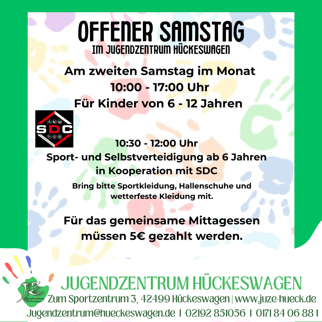 Von 10:30 - 12:00 Uhr bietet der SDC ein Sport- und Selbstverteidigungsangebot an. Dieses ist für die teilnehmenden Kinder kostenlos. Das Angebot findet in der Mehrzweckhalle statt. Es müssen Sportkleidung und Hallenschuhe mitgebracht werden.